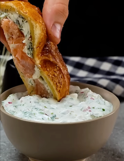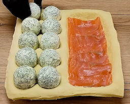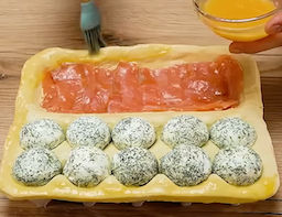 For The Pie: 1 empty egg carton (egg indentations on one side only) 1 puff pastry sheet (700 g/25 oz) For The Filling 50 g soft butter 200 g smoked salmon 300 g cream cheese 30 g fresh dill (finely chopped) For The Sauce 1 egg, beaten 2 g sesame seeds 20 g finely chopped fresh parsley 1 small red onion, finely chopped 6 g finely grated garlic 2 g salt 1 g ground black pepper 2 oz olive oil 150 g yogurt |