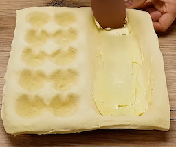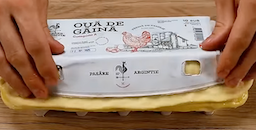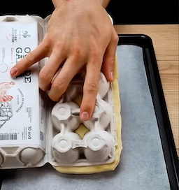 Place puff pastry and press into indentations. Press by hand on the large open side of the carton, and use an egg to press the puff pastry into the indentations on the other side of the carton. Cut excess dough with scissors.