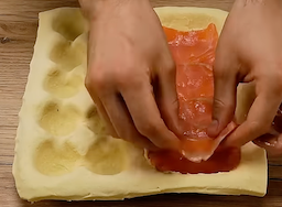Evenly distribute the smoked salmon over the buttered half of the pastry shell.